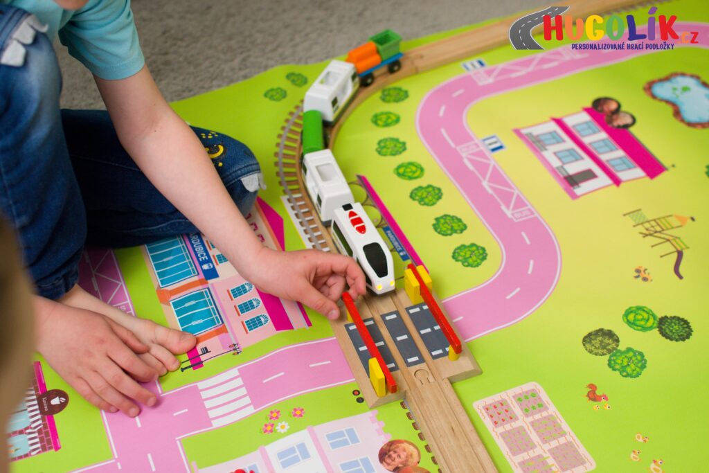 Na nakreslené koleje lze poskládat běžnou dřevěnou vláčkodráhu. Po podložce se tak mohou prohánět i mašinky, auta čekat na přejezdu a hraní tak dostane další nový rozměr.