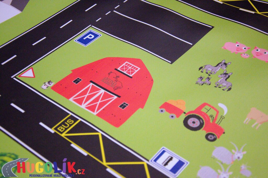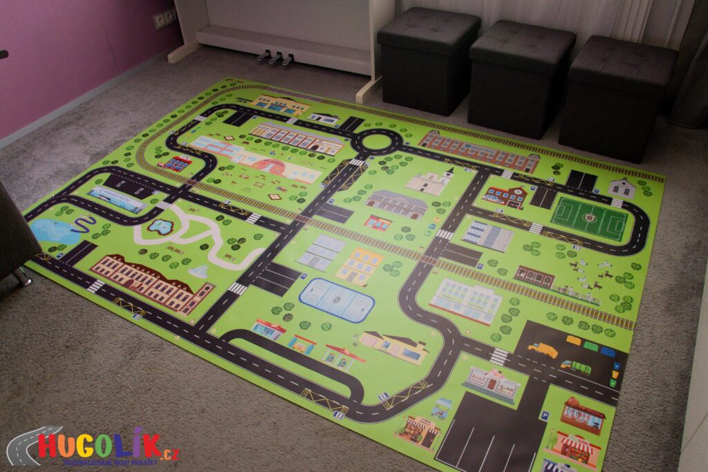 Jízda autíčky, vláčky a manipulace s hračkami: Podložka je ideálním místem pro rozvoj jemné motoriky i orientace v prostoru.