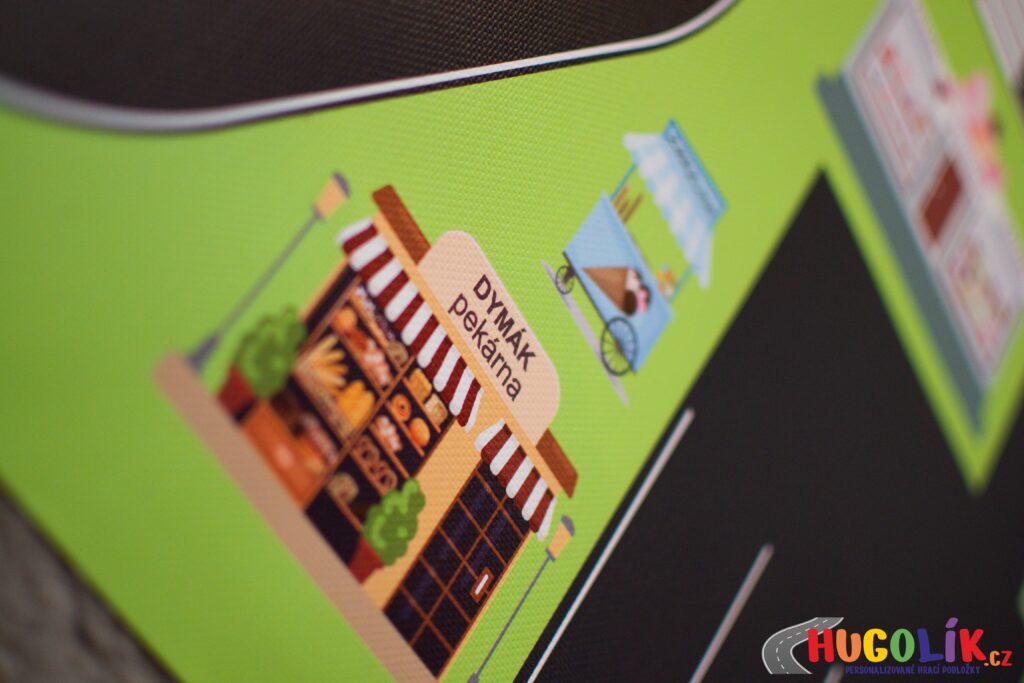 Základy a pravidla opatrného a ohleduplného chování jako chodec nebo jezdec na ulici. A ano, na ulici, kterou děti znají, protože podložka je personalizovaná – k takovému tréninku a učení je HUGOLÍK ideální parťák.
