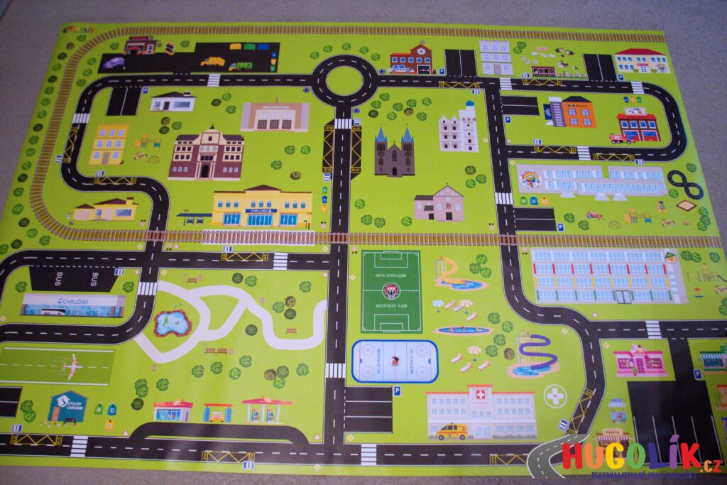 Jízda autíčky, vláčky a manipulace s hračkami: Podložka je ideálním místem pro rozvoj jemné motoriky i orientace v prostoru.